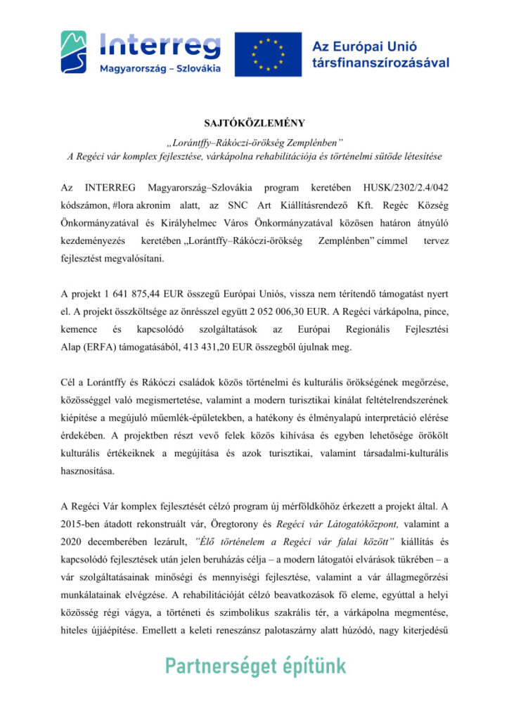 A Regéci vár komplex fejlesztése, várkápolna rehabilitációja és történelmi sütöde létesítése